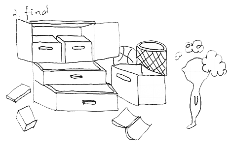 The project is based on an ethonography study. The subject, who is in her seventies, is hard to get rid of things, so that she piles up family albums, sweaters, Christmas things in the basement and several closets. Some of them have already be forgotten but occupies spaces; some of them might be used again but hard to be found. She used to hold garage sale, but hasn't do so since she moved to Indiana 11 years ago.