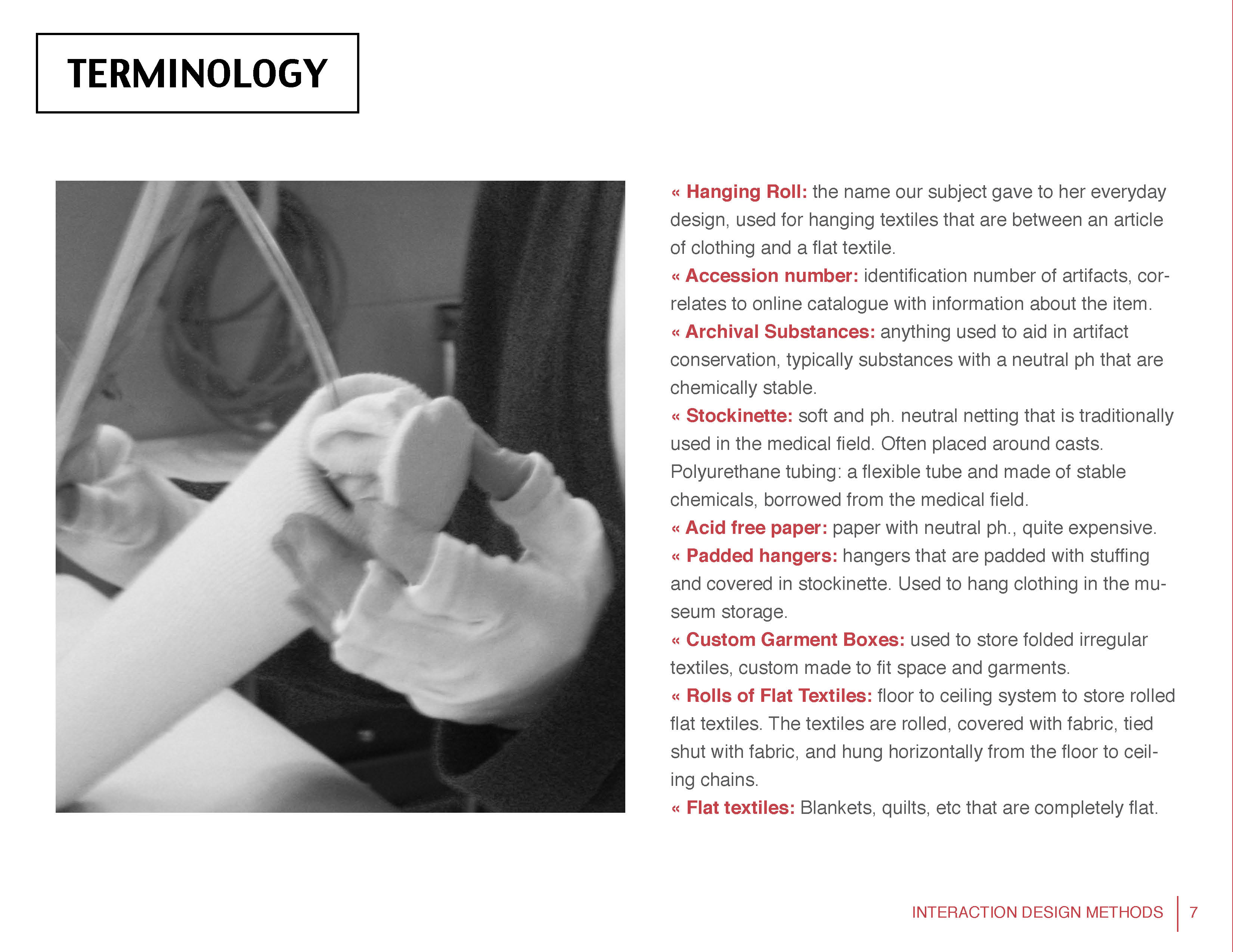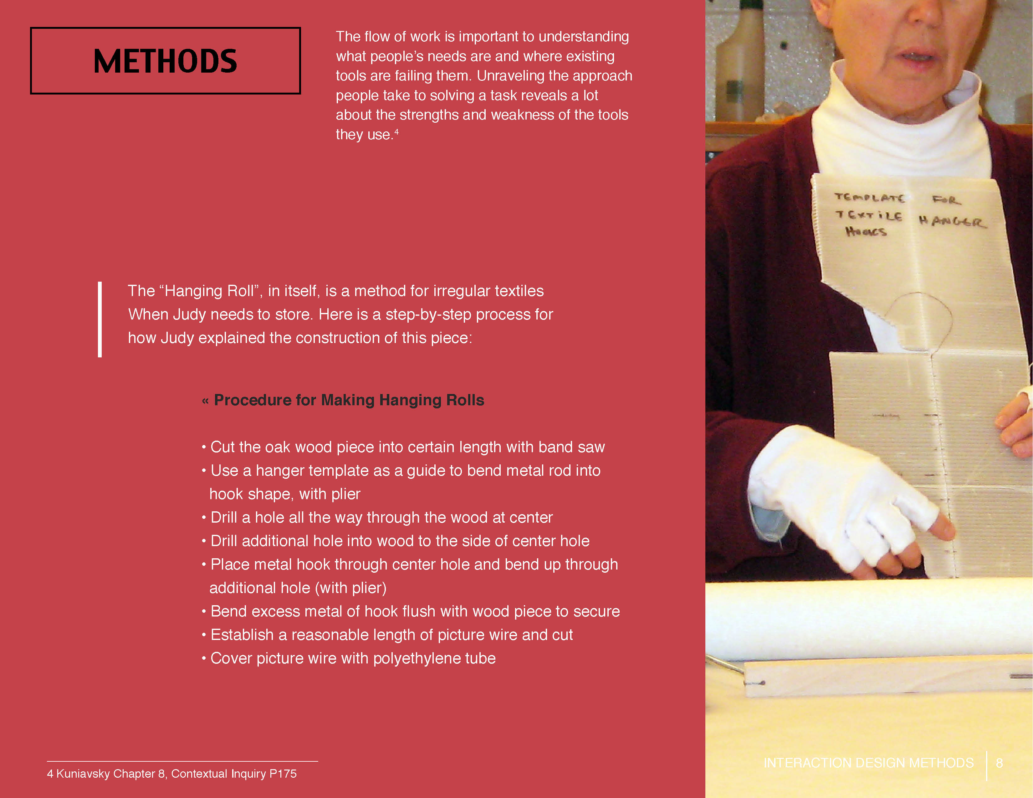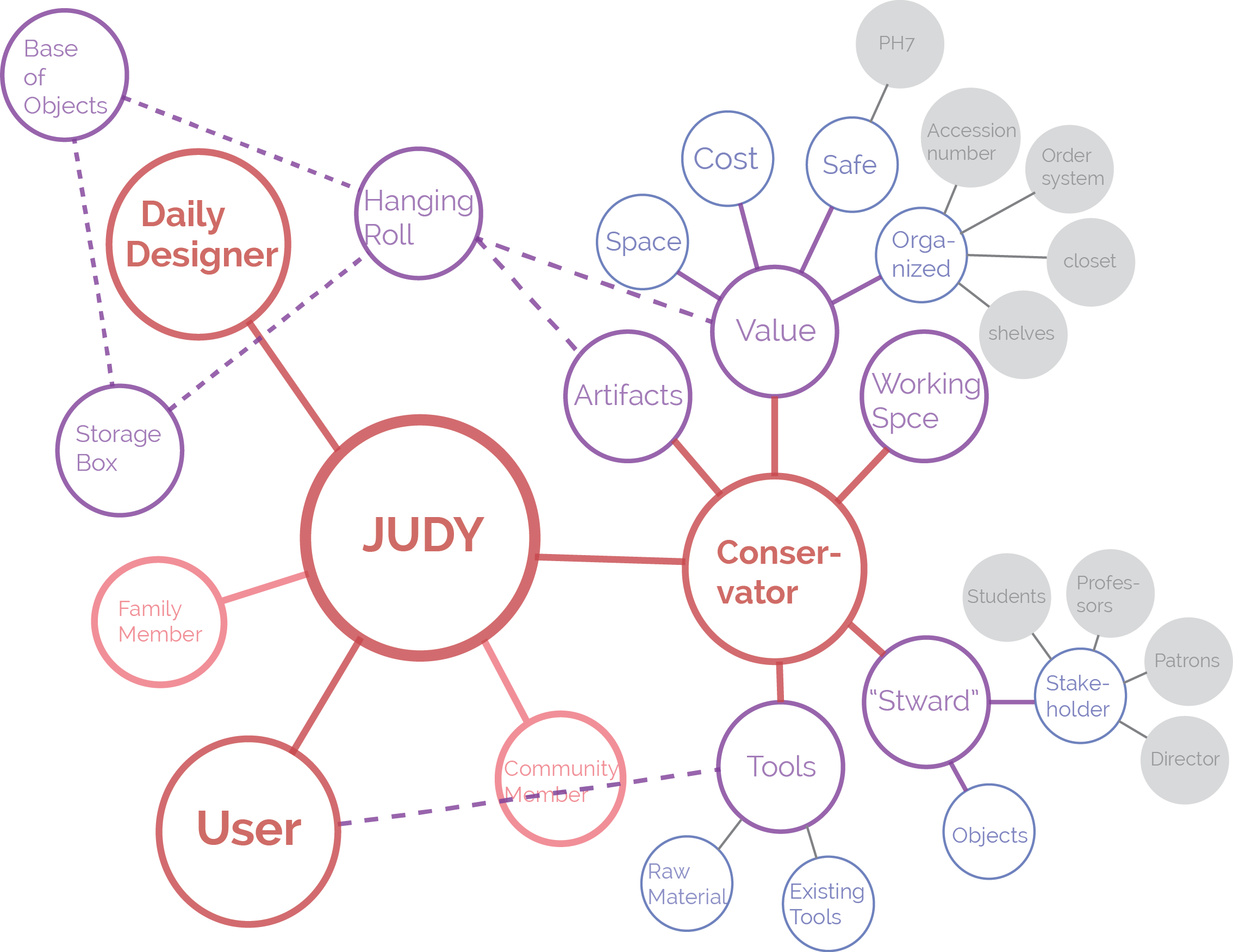 Our subject Judy works as a conservator at the Mathers Museum. She designs and creates storage mounts for ethnographic artifacts, and with very little money in budget, she has to scrounge a lot and find alternative uses for day-to-day things. The “Hanging Roll” is one of her designs. Grounded on the contextual inquiry, we then analyze user profile and affinity diagram, from which we develop more concept of everyday design.
