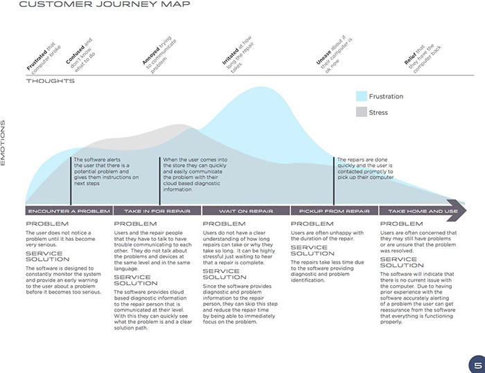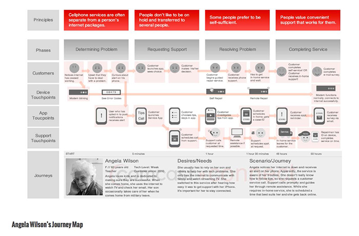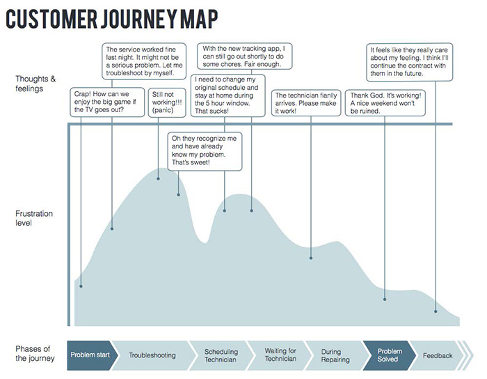 Researchers use Customer Journey Map to record user's feeling and thoughts, according to phrase of journal. They also do observation on user's emotion level at different touch points.