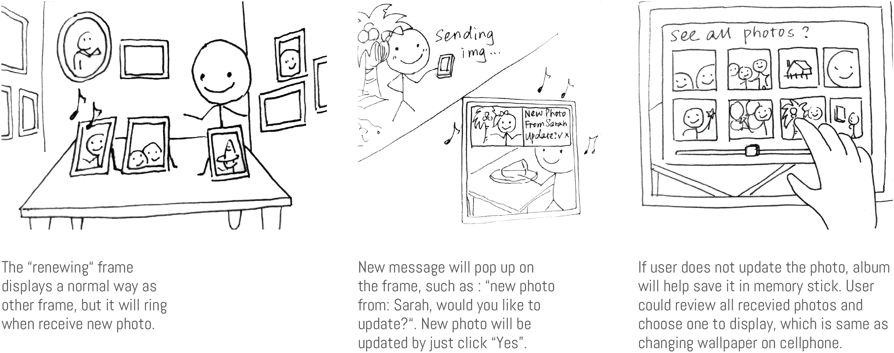 The project is also based on the ethnography study with subject Barbee. The subject framed the photos of her children, grandchildren and other family member at home. But it takes much time for updating these photos. The print version of photo is waste of time and paper. The renewing frame is designed to make this process automatically. For instance, the subject could receive her daughter’s new photos on the digital frame by clicking receive button. It is easy for her daughter send photos to mum wherever and whenever.