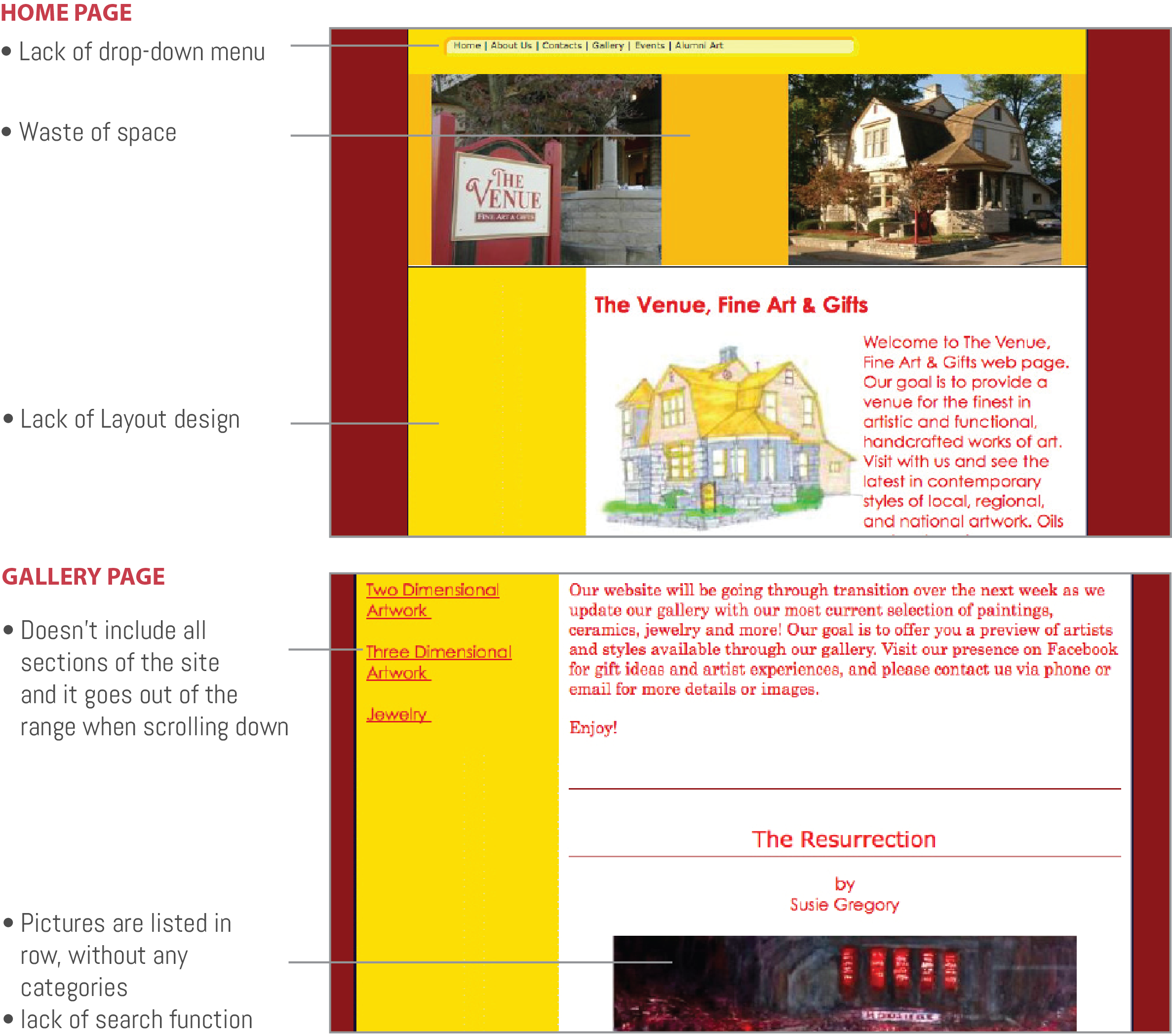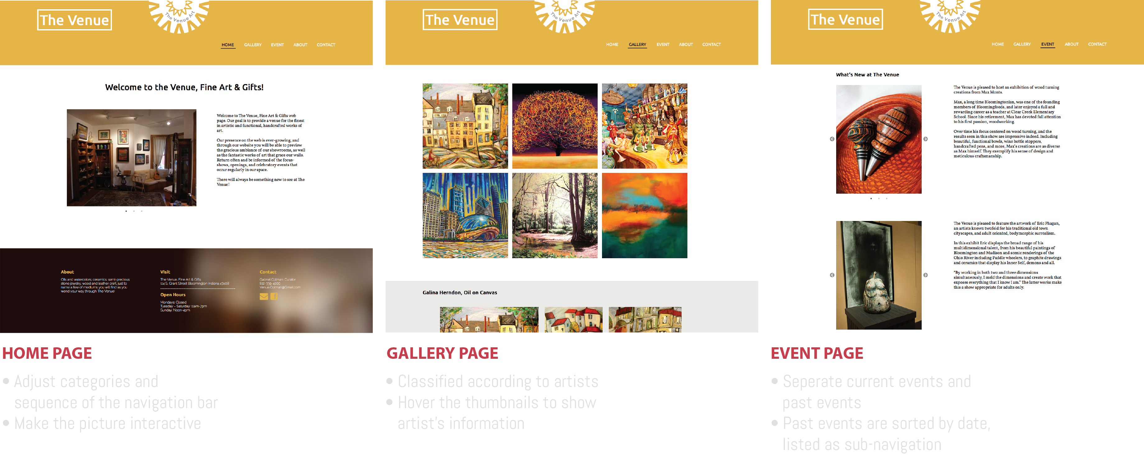 The current venue page is managed by curator with regular updating. However, there are several problems which might drive unpleasant user experience. For instance, the contents are not categoried, which is lack of options for user but scrolling all way down. The weak interection deisgn web makes user view pictures passively. In order to create a better browsing experience, the web should be interactively.