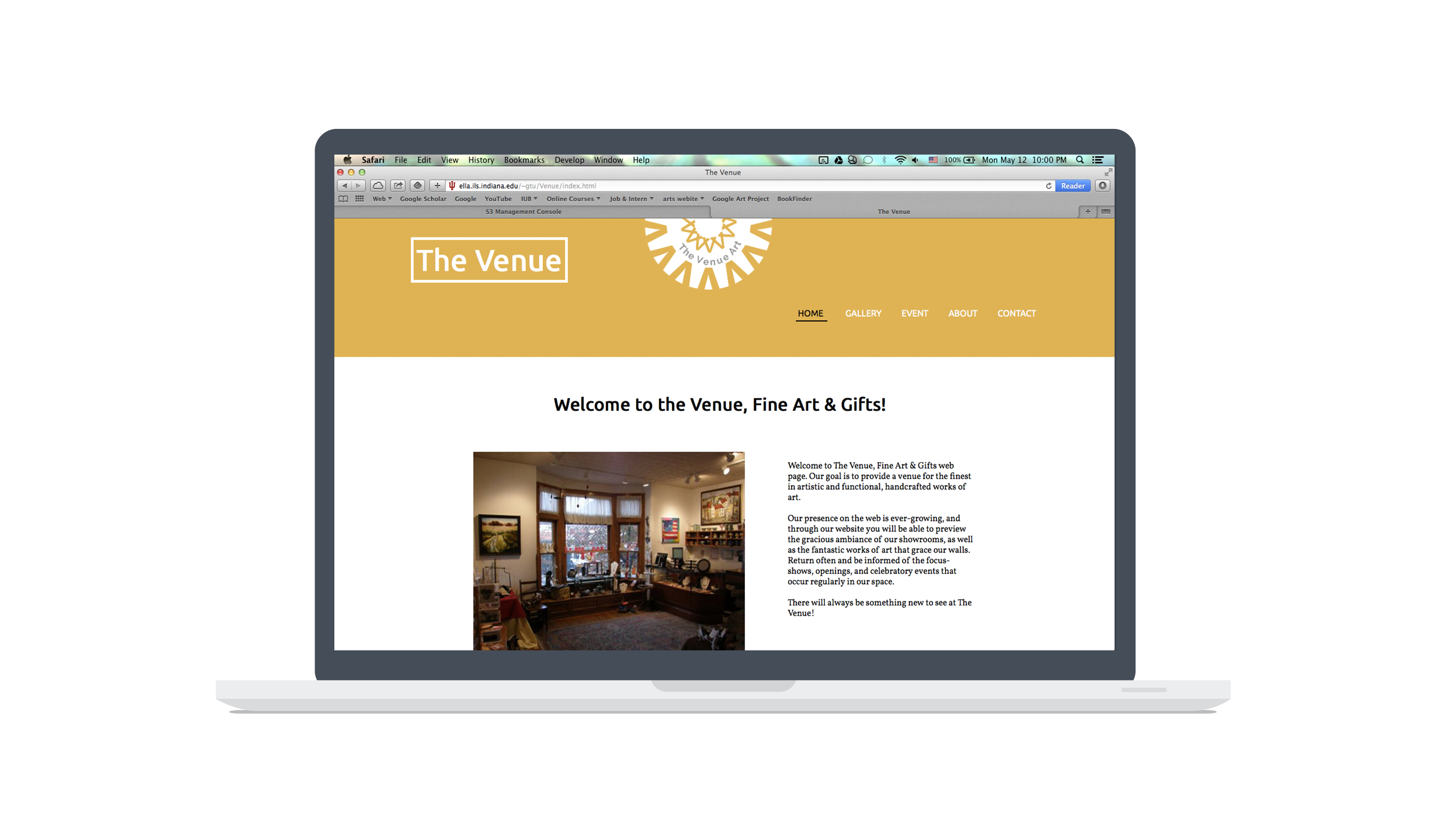 The Venue, Fine Art and Gifts, located at the downtown Bloomington, has art works range from handcrafted jewelry, sculptural pottery to oil, watercolor painting.